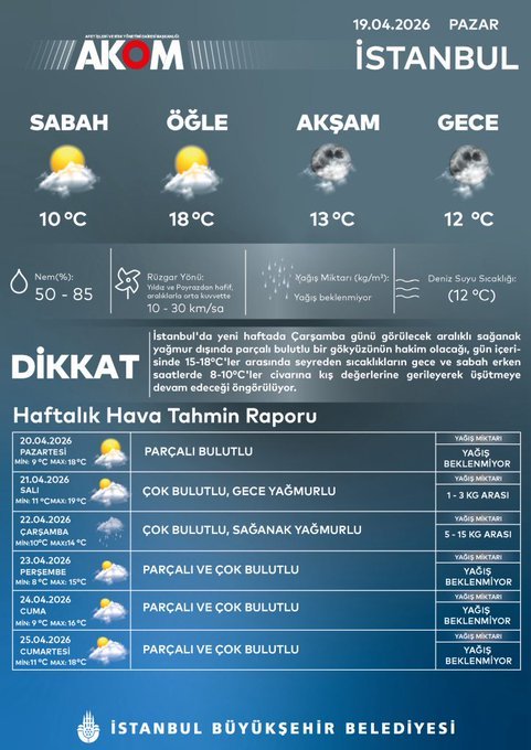 İstanbul Büyükşehir Belediyesi (İBB) Afet Koordinasyon Merkezi (AKOM), kentin önümüzdeki bir haftalık hava durumuna ilişkin tahmin raporunu paylaştı. Rapora göre […]